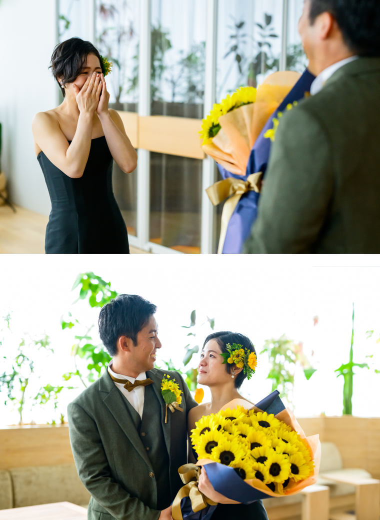 ご新郎様からご新婦様へ、サプライズで贈られたのは——50本のひまわりの花束。