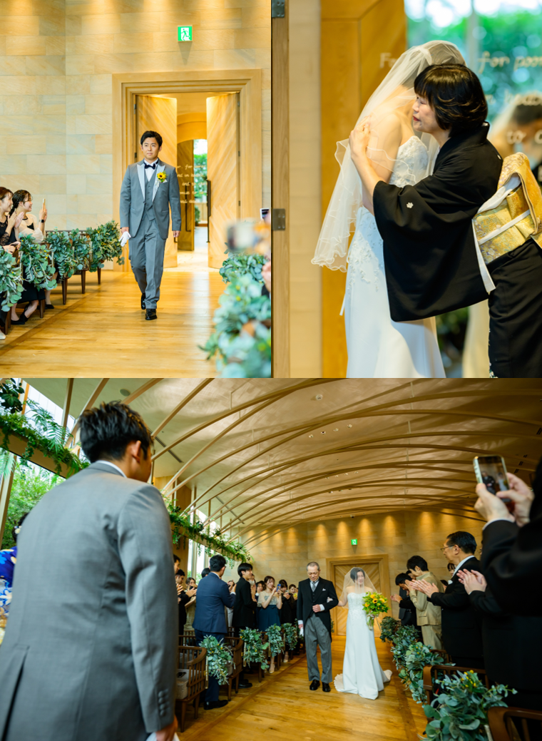 ご新婦様はお母様にベールダウンを、お父様と腕を組み、一歩ずつバージンロードを進む姿には、思わず感動の涙がこぼれるゲストの姿も。