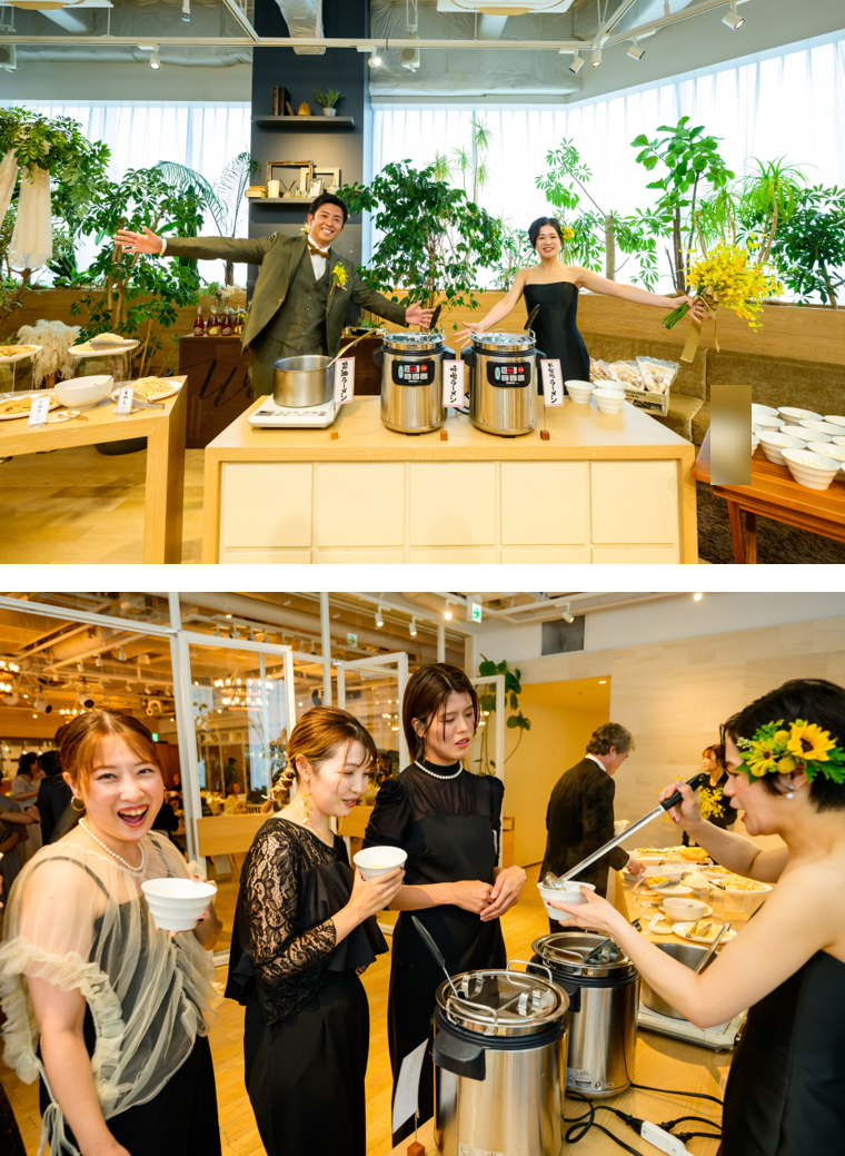 ゲストとコミュニケーションをとりたいというおふたりのイメージにビュッフェはぴったり!ただのビュッフェではなく、更に付加価値をつけたい…ラーメン尽くしのご希望にあわせ、おふたりの大好物をゲストにもふるまえること、おふたりだけのラーメンビュッフェをやるほかない!と即決でした。3種類のスープと8種類の具材がずらりと並び、楽しそうにトッピングするゲストの様子に、おふたりにもはじけるような笑顔が浮かびます。