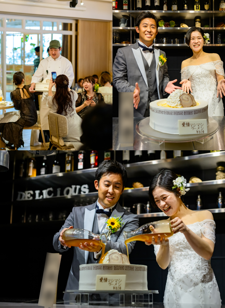 注目シーンであるケーキセレモニーはおふたりがお好きなラーメンをケーキで再現!