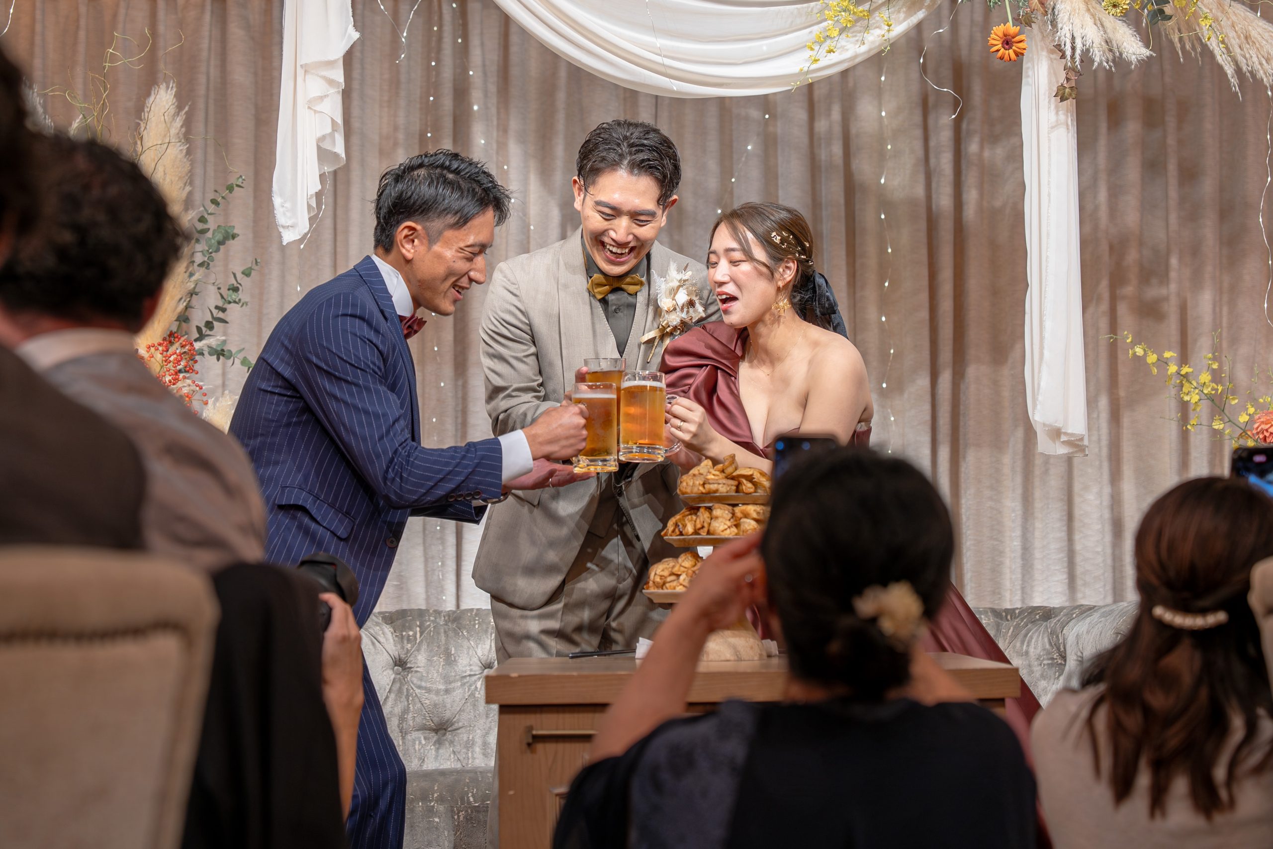 お酒好きなご新婦様のこだわりで、クラフトビールをご用意。グラスを片手に乾杯のご発声後は会話が弾む、肩肘張らない時間が流れます。