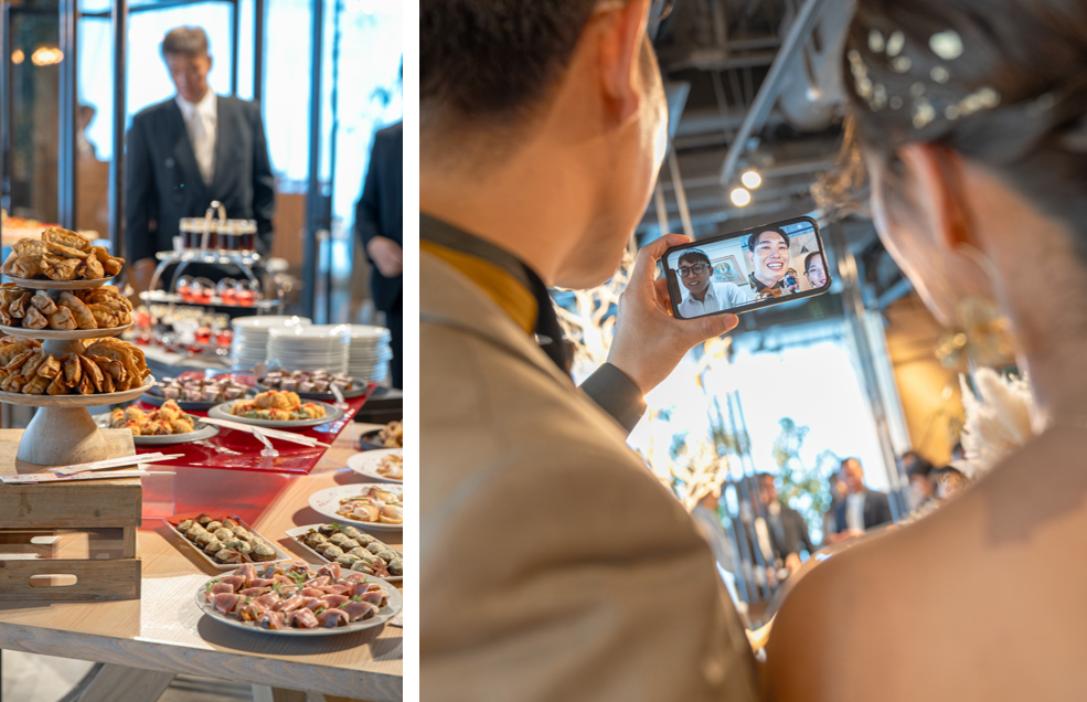 会場が一体となって盛り上がる中、ホワイエのカーテンがオープンし、デザート&おつまみビュッフェがスタート。笑いと驚きがあふれる、まさにおふたりらしい自由な時間に。