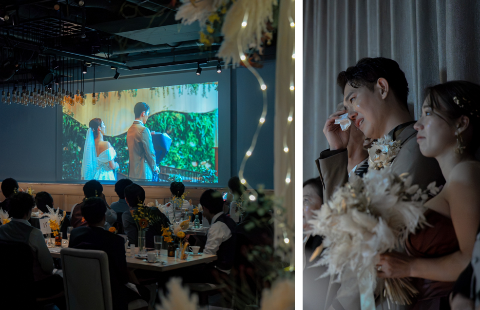 披露宴の幕開けは、ご新郎様手作りのオープニングムービーを巨大な一面スクリーンで上映。