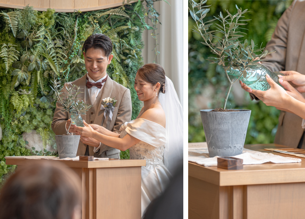 指輪交換の後には、結婚証明書の代わりに“オリーブの木に水をそそぐ”セレモニーを。家族の想いを受け継ぎながら、おふたりの未来をともに育んでいくことを誓いました。