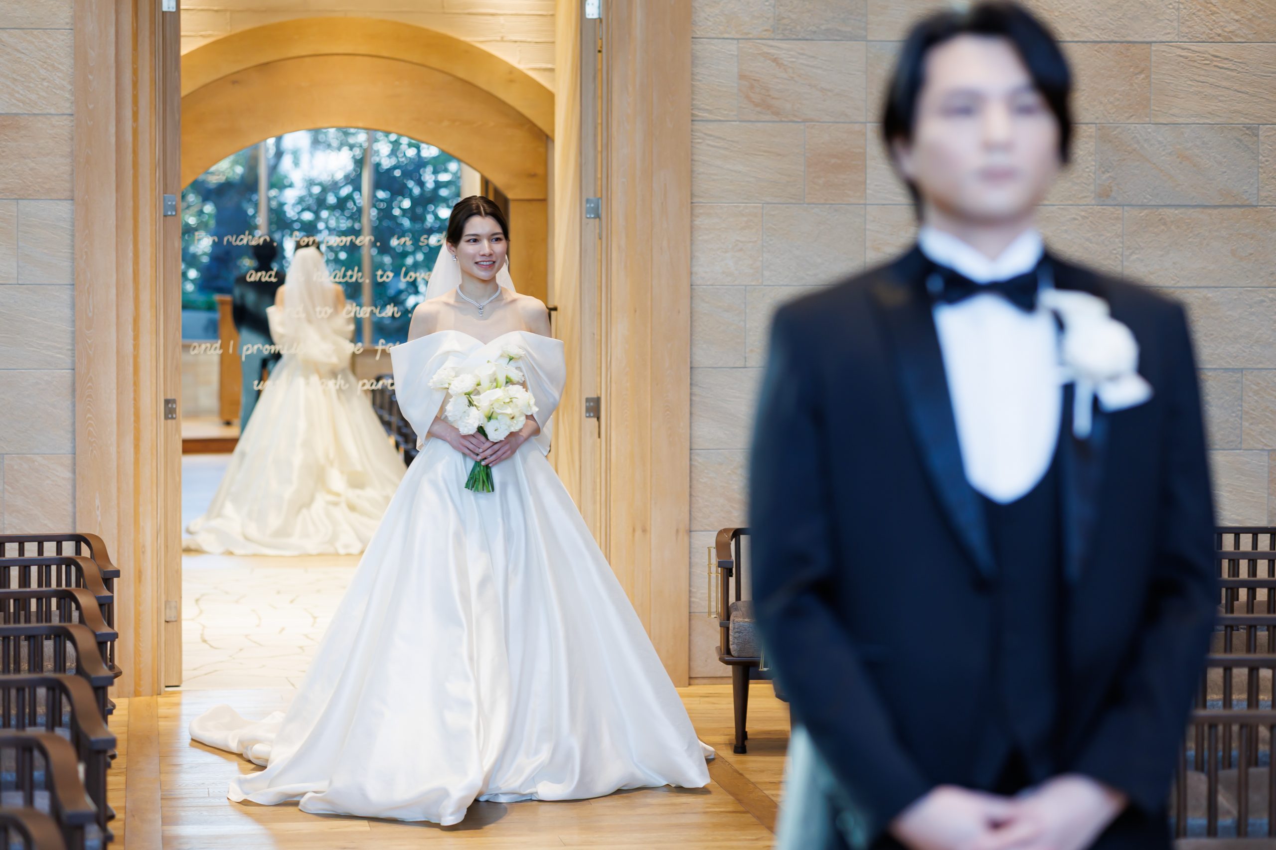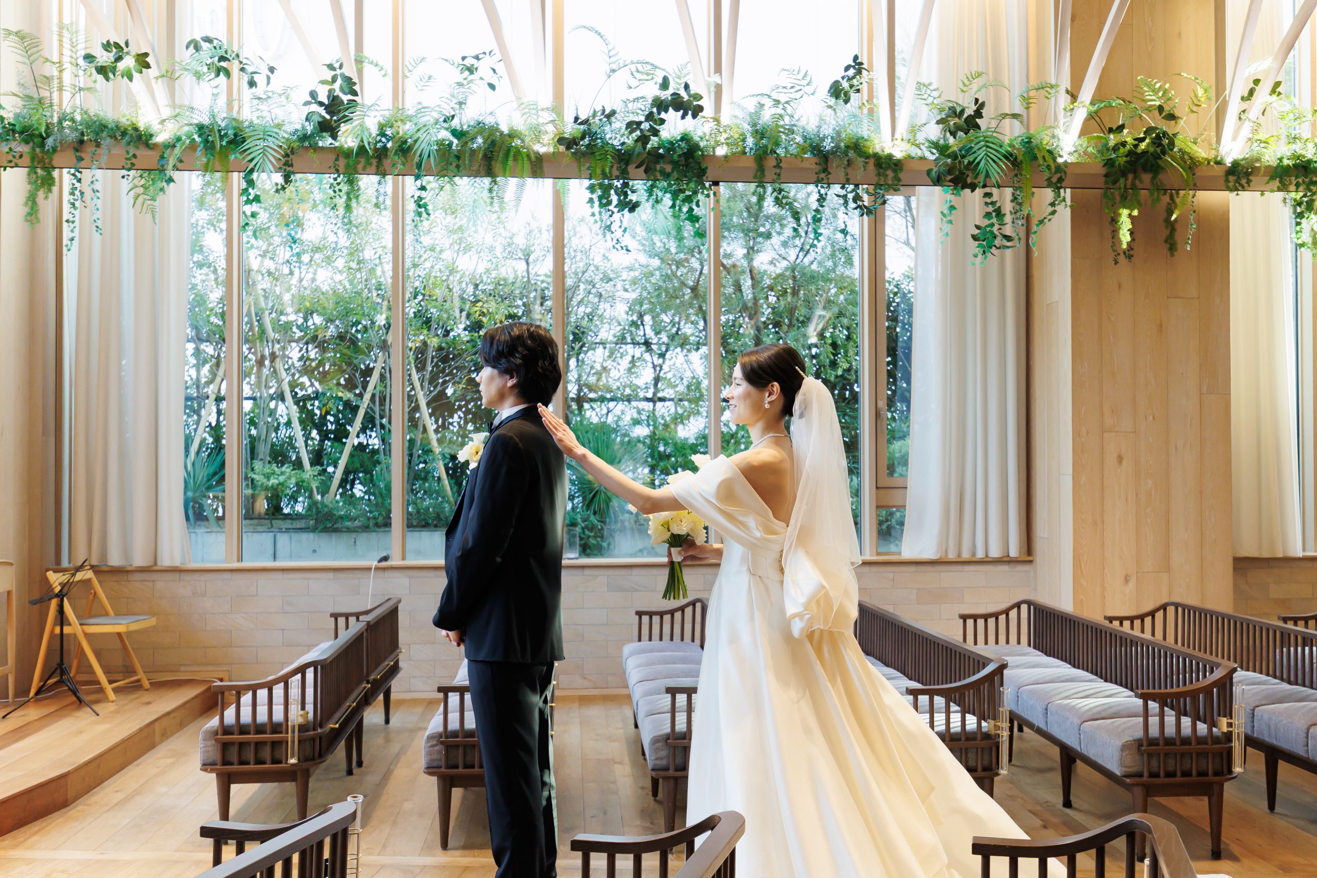 ファーストミートは、新郎が後ろ向きで待ち、新婦が肩をトントと叩くサプライズスタイル。振り向いた瞬間のリアルな表情が、忘れられないワンシーンに。