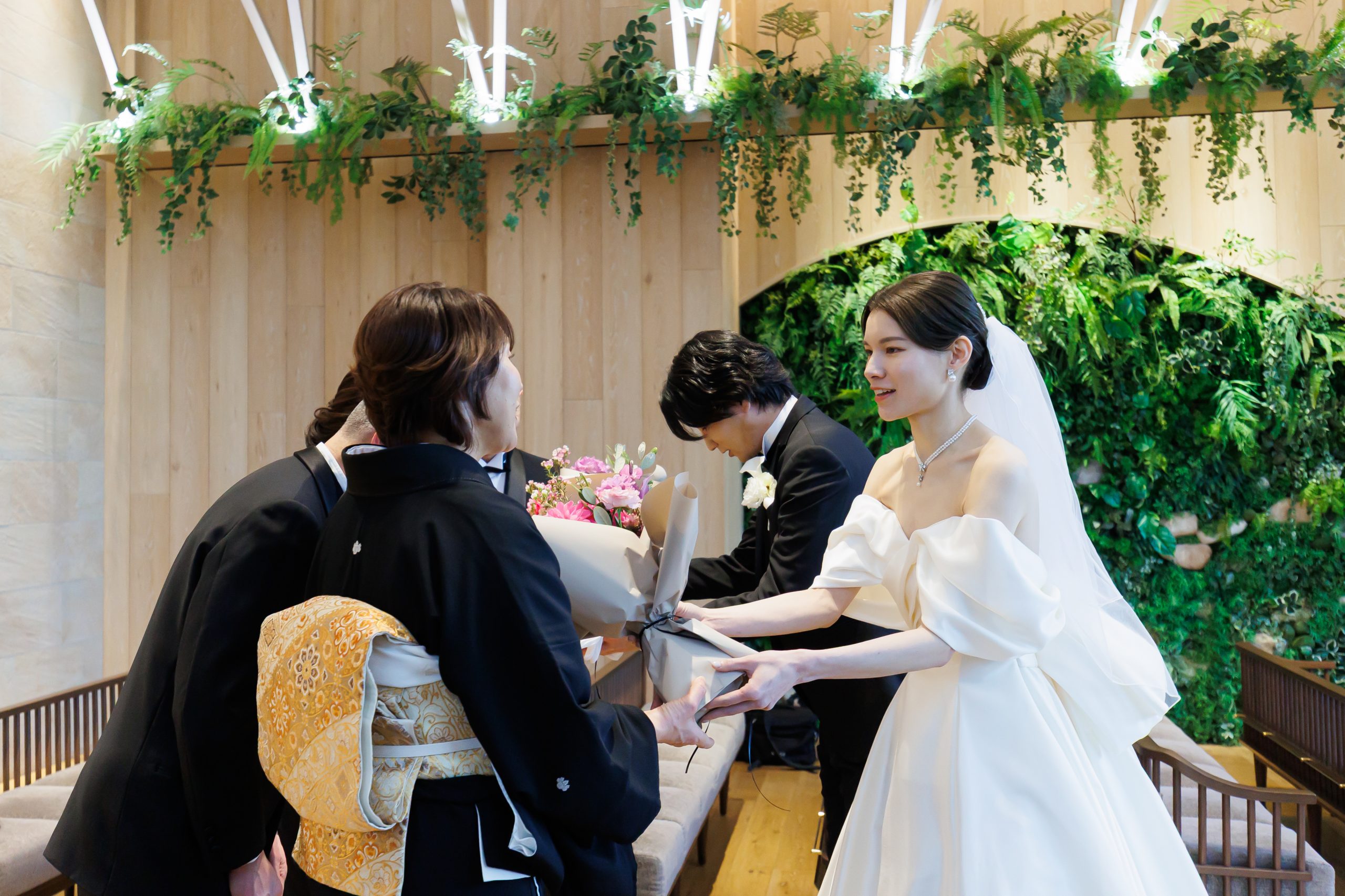 さらに挙式前にはチャペルでのファミリーミートを実施。花束とメッセージボードに想いを込めて、親御様へ感謝を伝える時間を設けることで、披露宴は純粋にゲストとの時間へとつなげます。