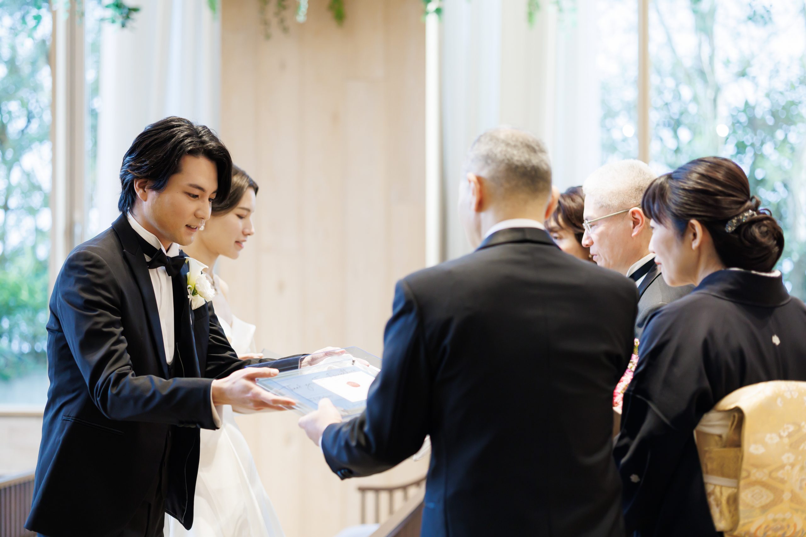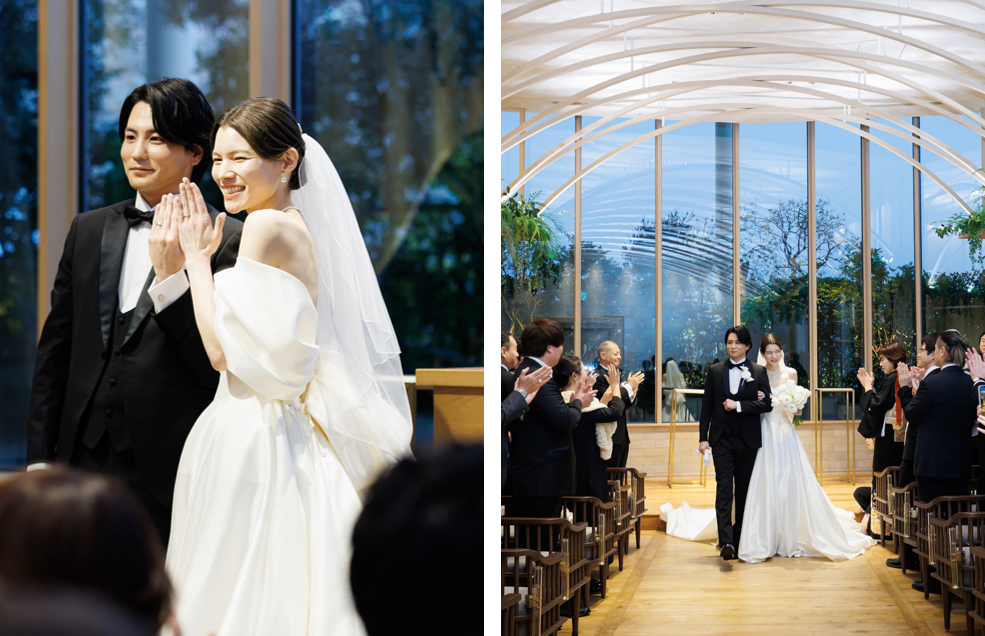 挙式は人前式をセレクト。新郎新婦での入場から始まり、ゲストに見守られながら進行するセレモニーは、堅すぎず、それでいて特別感のある時間に。事前に家族への想いを伝えているからこそ、挙式では“今この瞬間”にしっかりと向き合える構成に。