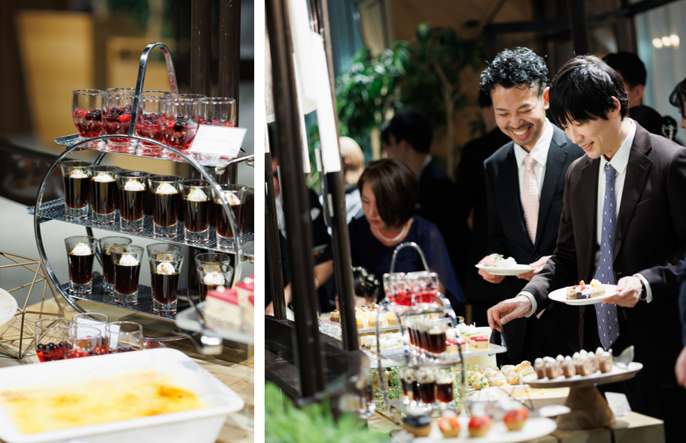 さらにデザートビュッフェでは、自由に選ぶ楽しさと会話が広がる時間を演出。歓談中心のパーティだからこそ、“食べる時間”そのものがゲストとの大切な交流のひとときとなり、五感で楽しむおもてなしを。