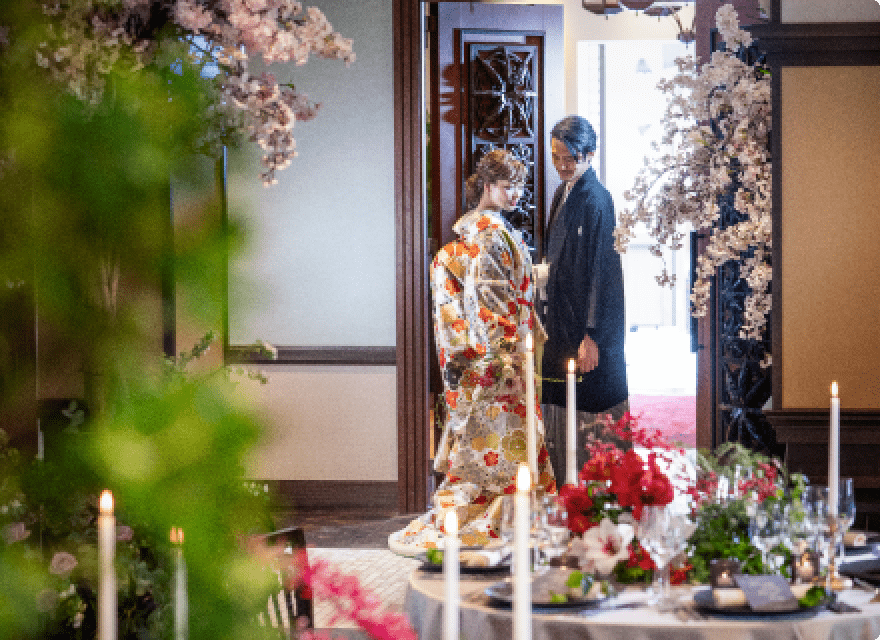世界文化遺産、清水寺から徒歩3分。館内から八坂の塔を望む京都ならではの立地です。和モダンテイストの会場は華やかなドレスも雅な和装も映えます。