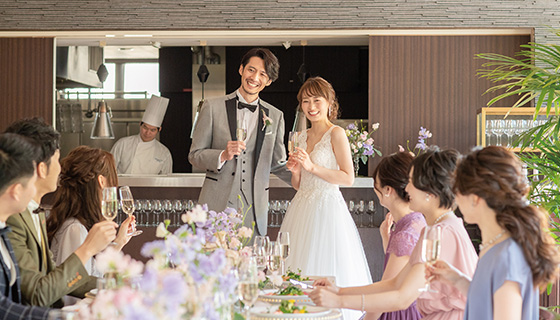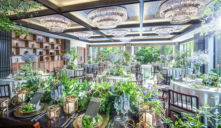 40名までのアットホームな結婚式にぴったりの少人数専用会場を備えています。端正な庭園を眺め、オープンキッチンも。美食と会話を愉しむ会場です。