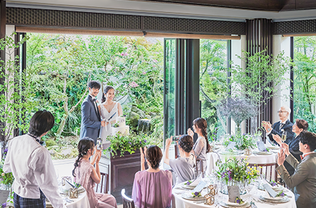 1階のパーティ会場「KIYOMIZU」は、最大140名さままで対応。季節の彩りを映す美しい日本庭園、オープンテラスの演出などおふたりらしいパーティが叶います。