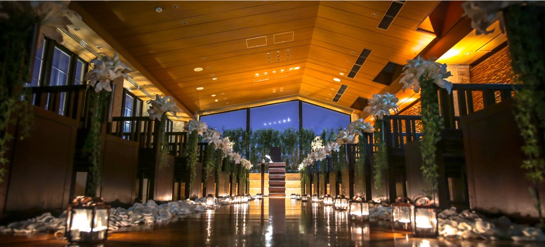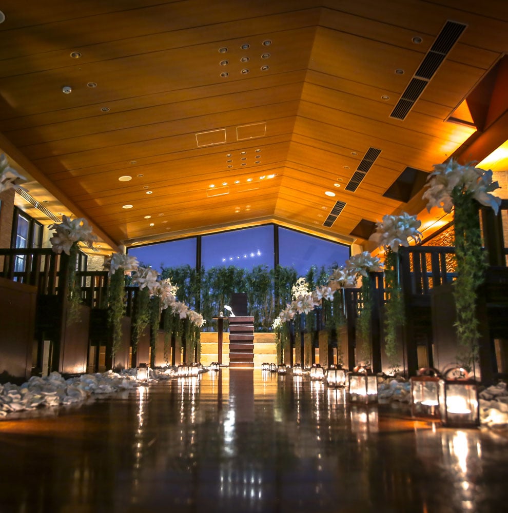 チャペルの窓一面に広がるのは東山の景色と青い空。「清き水」の音だけが軽やかに心地よく響きます。縁結びの神様として1300年以上もの間、信仰を集めてきた「地主神社」の神様に見守られて、とっておきの一言を。生涯忘れることができない一瞬を迎えませんか。