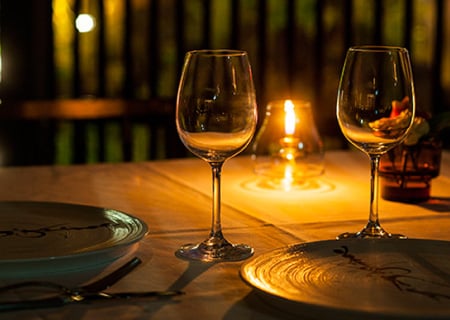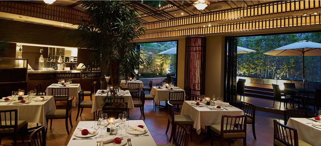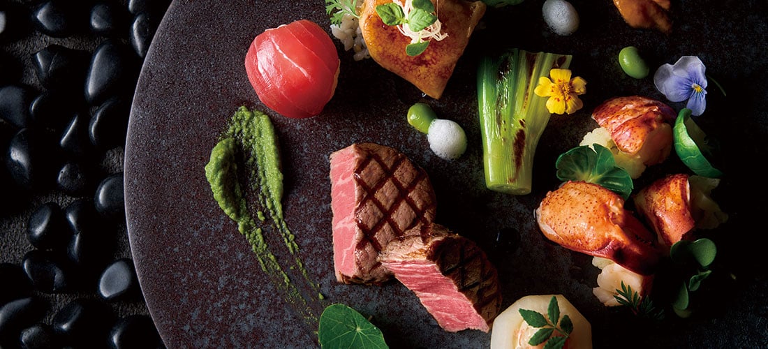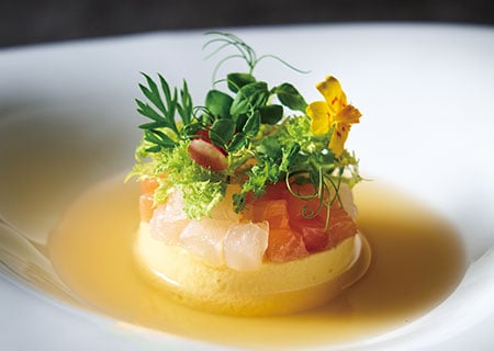 京都上賀茂で獲れる京野菜や、近海の港で水揚げされた魚介類、愛情をかけて育てられた但馬牛など、この地ならではの食材の清麗な味わいを大切にしました。モダンな感性で仕上げ麗しく盛り付けられたオリジナル京フレンチが、おふたりの大切な時間をご一緒します。