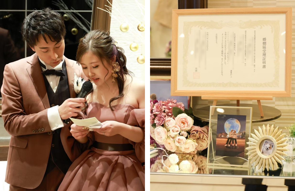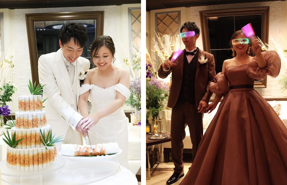 また、ウェディングケーキは、誰とも被らない結婚式にしたいという想いがあったのと、愛犬の「ちくわ」を会場に連れて来られなかったこともあり、ちくわを4段のケーキ型に並べた「ちくわタワー」にしています。ゲストからは「料理が美味しかった」「スタッフの対応が丁寧だった」という感想をいただくことができて良かったです。