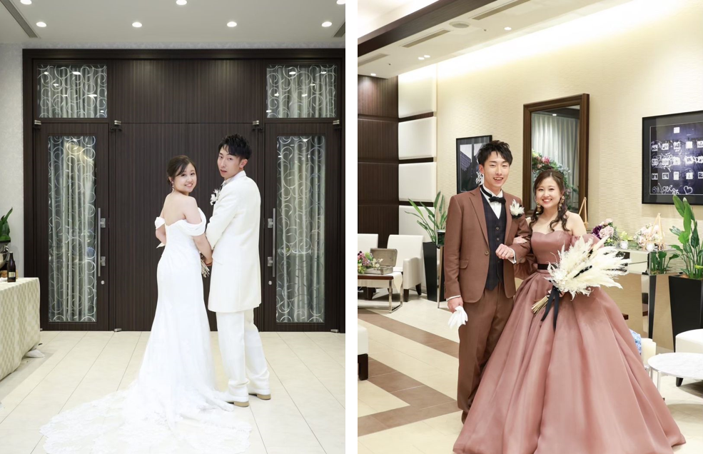 1着目は裾に花があしらわれたマーメイドドレスで、カラードレスとは異なる綺麗めな印象のものにしました。2着目は一目惚れしたピンクブラウンのAラインドレスで、当日はオフショルダーにして大人可愛く仕上げています。今振り返ってもこのドレスにして良かったと思えるほど好みの一着でした!