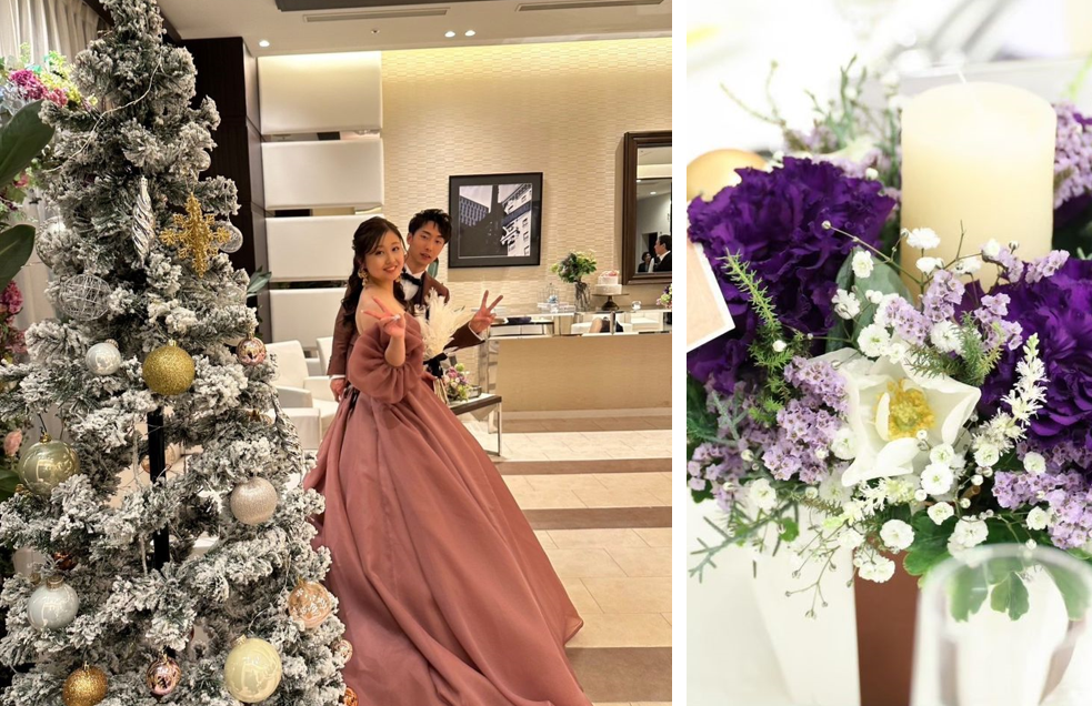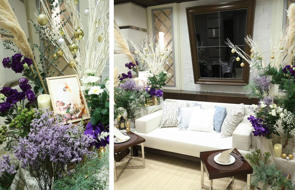 季節に合わせ「大人なクリスマス」をテーマに、白・ゴールド・緑を基調とし、夫の好きな紫をアクセントに加えました。 キャンドルやオーナメントを添えて、クリスマスらしい華やかな空間に仕上げてもらっています。