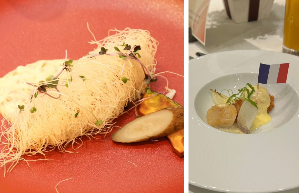 料理は「大人のお子様ランチ」をテーマに、シェフと一緒に一から考案したものです。私たちの好きなものも取り入れたいと相談したところ、ムースで作ったお寿司やメロンソーダ風のお口直しなど、遊び心のあるメニューを創作してくださいました。