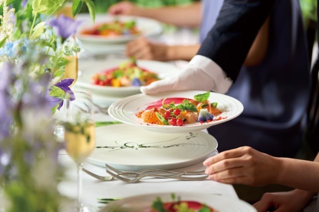 おふたりの想いをのせた一皿を創り上げるため、お話を伺い、それをどう表現するのかじっくり考えています。すべての料理人たちが丁寧に細部までこだわり、サービスが皆さまにそのカタチをお届けします。おいしく美しい一皿が想いを届け、笑顔を生みますように。