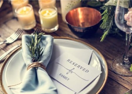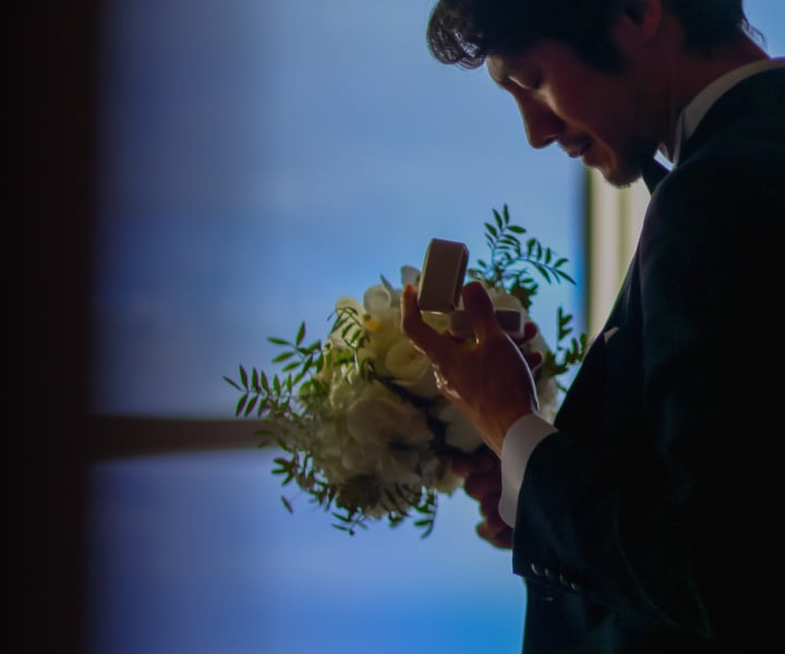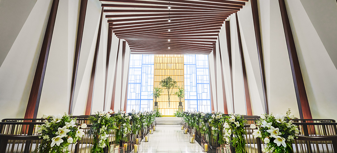 昼間は自然光が祝福のシャワーのように降りそそぎ、夜はキャンドルの灯りが揺らめき幻想的な雰囲気を見せるチャペル。緑や木の温もりとシンプルモダンな建築美が調和した世界にひとつの舞台です。7mもの天井高をもつ広々とした聖なる空間をおふたりだだけの貸切に。