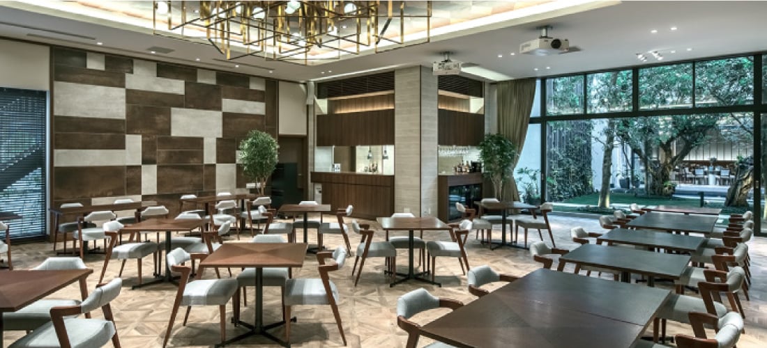 劇団四季の劇場に隣接する、名古屋の中心部。恵まれたアクセスと都市機能、文化がとけこむ絶好のロケーションです。一歩足を踏み入れた瞬間から街の喧騒が遠のくほど、緑あふれる居心地のいいダイニングです