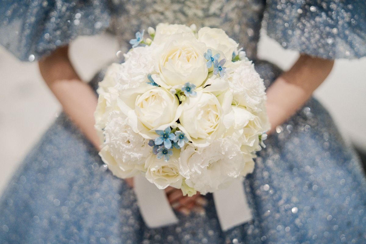白のバラをメインに、デルフィニウムやカンパニュラを使用してもらいました。ウェディングドレスにもカラードレスにも合うように、白・青・紫を基調にポイントでピンクを入れています。
