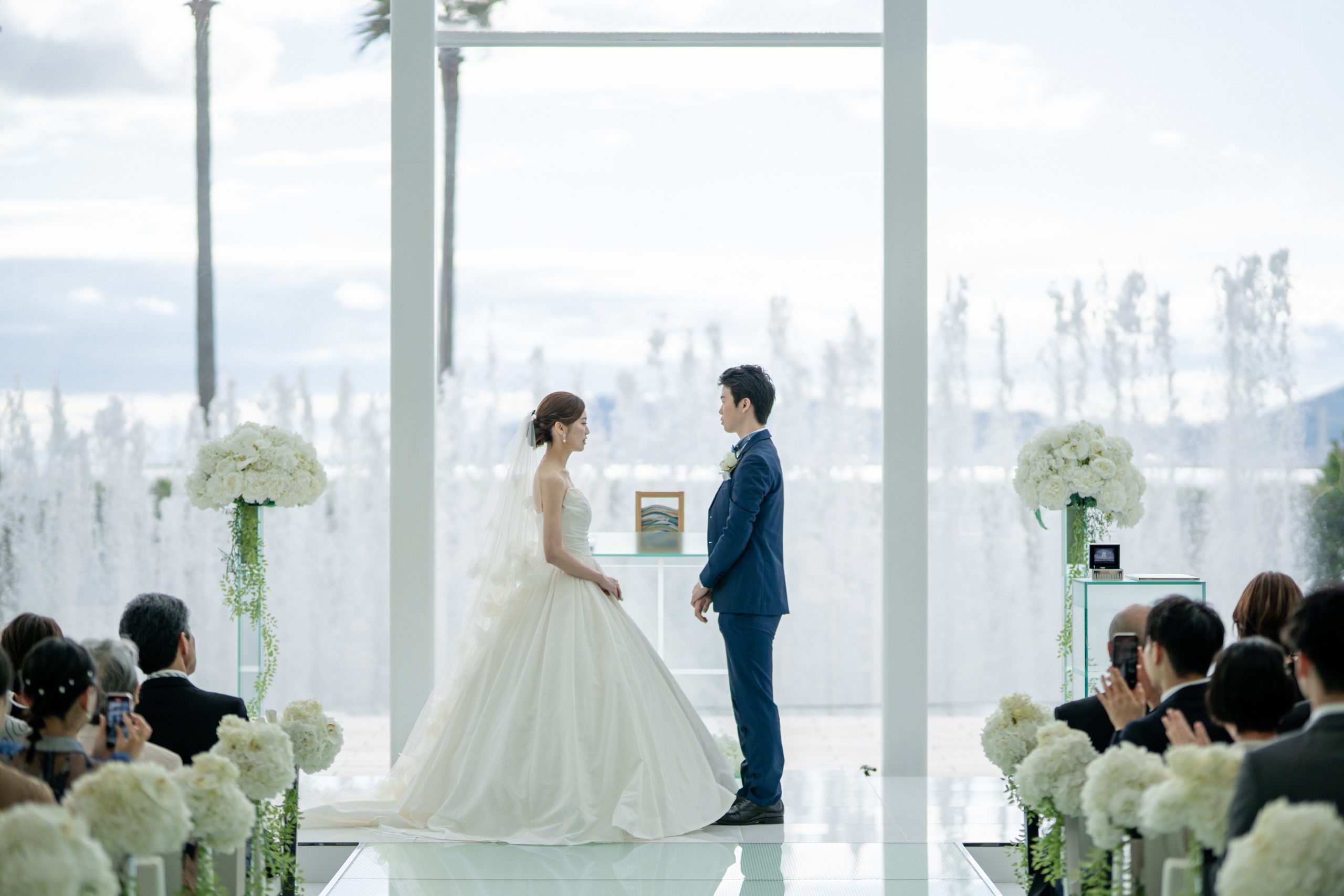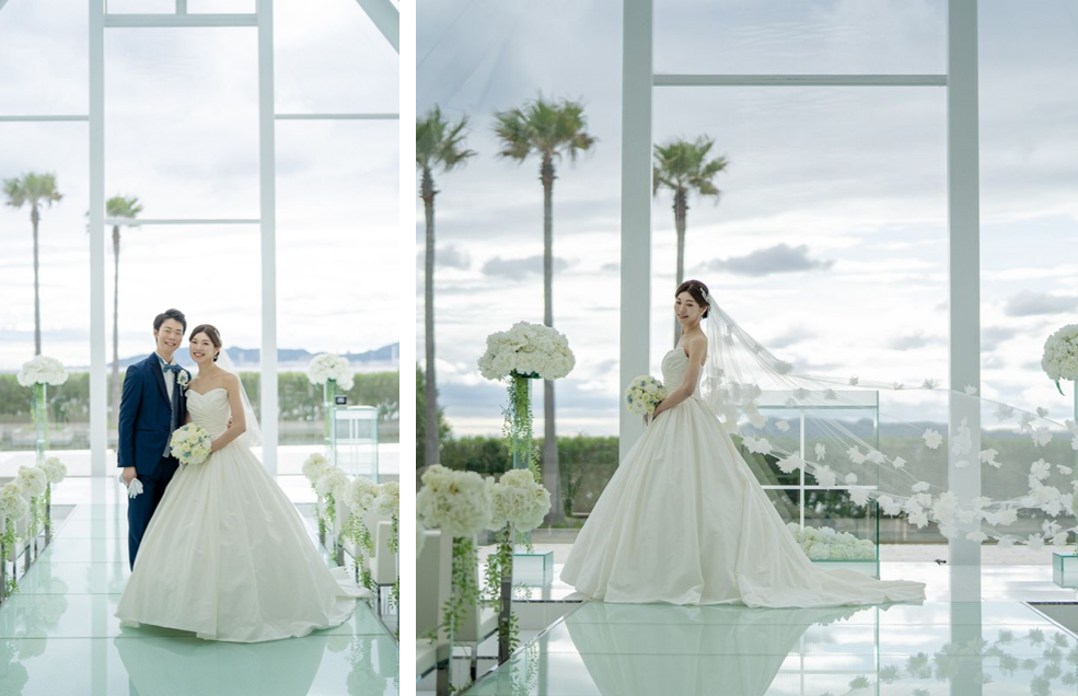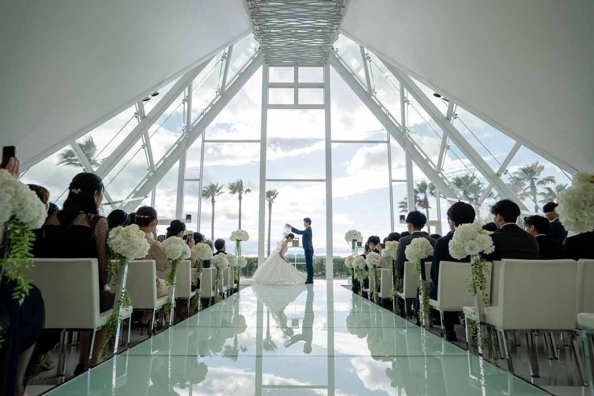 『ブルービジュー』は水辺に浮かぶチャペルで、オーシャンビューが魅力です。正面がガラス張りで開放感があり、光がたくさん入る明るい空間でした。