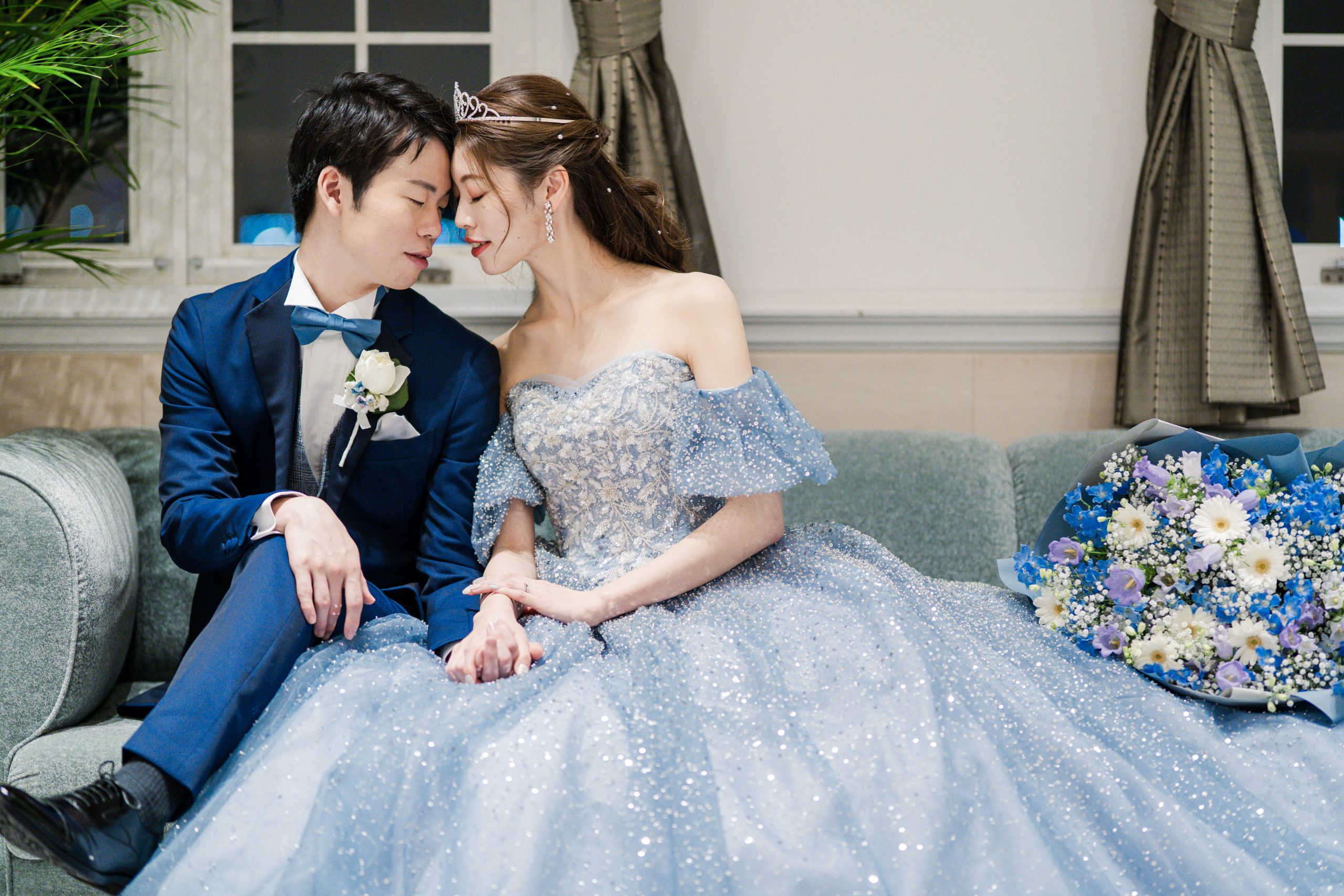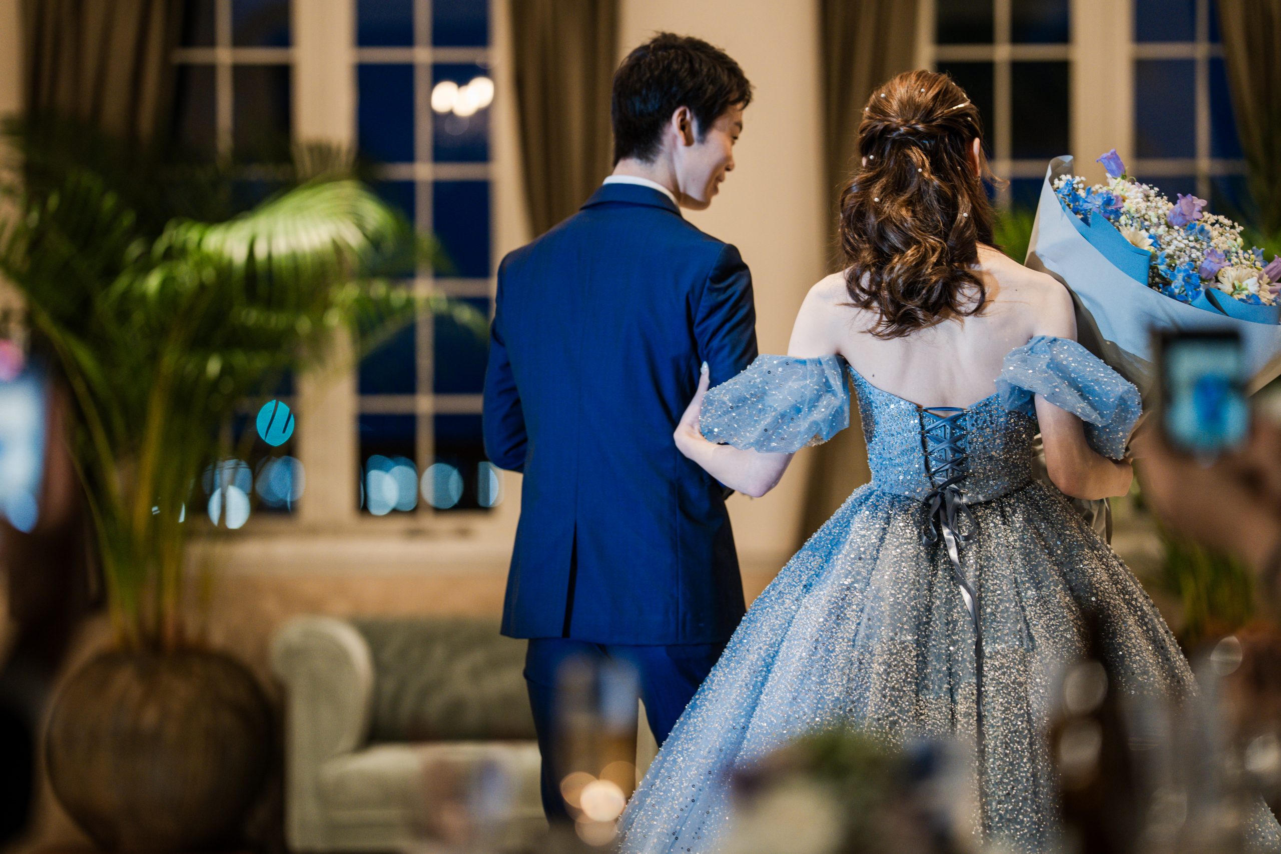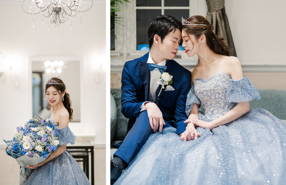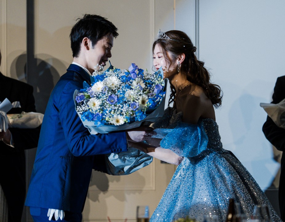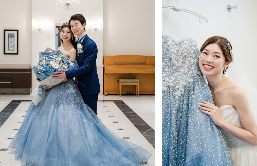 お色直しのドレスはプリンセスをイメージしたドレスをセレクト。小さい頃から水色が好きで、七五三の時に水色のドレスで撮影したことから、結婚式でも水色のドレスを着たいと思っていました。色々なブランドの水色ドレスを試着しましたが、こちらのドレスは動くたびにキラキラして華やかで可愛く、家族全員で意見が一致しました。