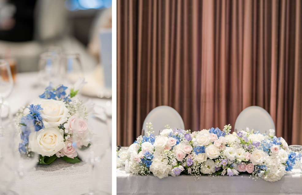 フローリストはLAGUNAPRIER(ラグナプリエ)さんで、イラストやイメージ画像を用いた細かい打ち合わせを重ね、当日はイメージ通りの装花に仕上げていただきました。