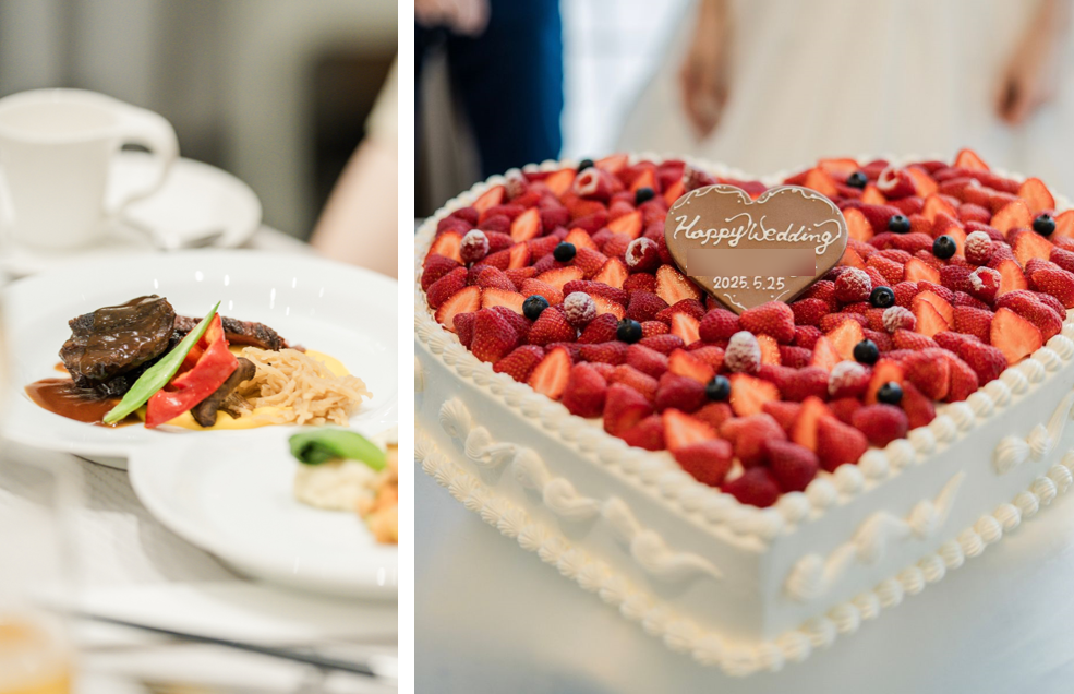 お料理は、5月の挙式だったため、旬の食材を取り入れた春を感じられるコースにしました。事前にアレルギー情報を確認し、全員が楽しめるメニューにしたことがこだわりです。