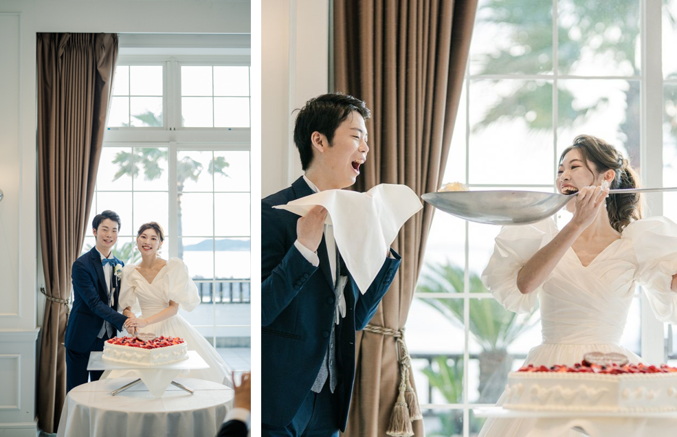 披露宴会場は白を基調としたヨーロピアンテイストの『ヴィスタ ティエラ』を使用しました。テラスがあるので、晴れていればテラスに出てリゾート風景の中で写真撮影が可能です。また、扉を開けると広いスペースがあり、余興などを行うのに十分な場所があるのも良かったです。
