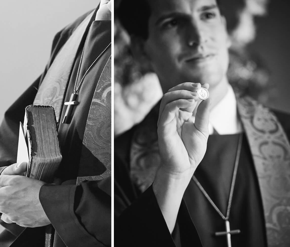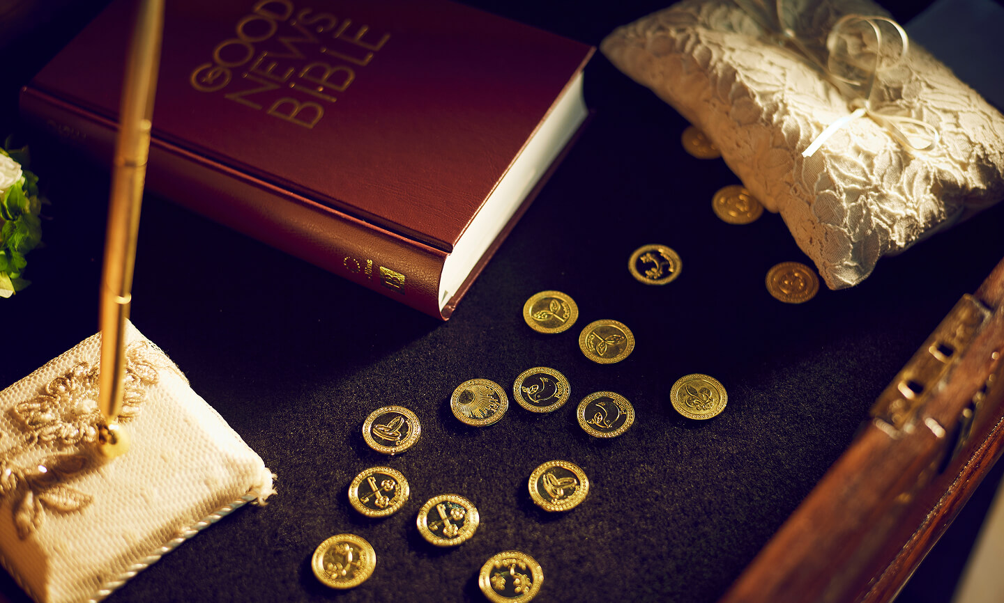 おふたりの想いを"かたち"にするオリジナルコインのセレモニー。牧師先生がカウンセリングで伺ったおふたりの想いをコインへ刻み込み、結婚証明書へと埋め込まれます。