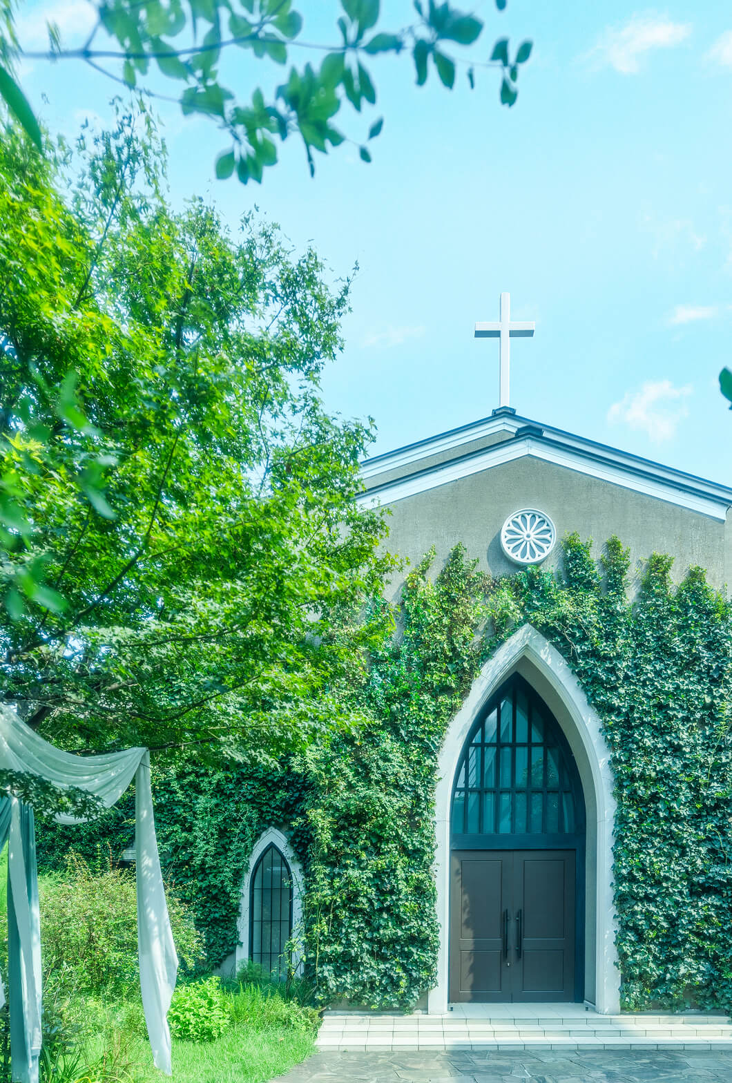 - B3出口を出て左の通りを青山通りに背を向けて真っ直ぐ進みます。突き当り、1分ほどで緑に包まれた南青山サンタキアラ教会のファサードが見えてきます。