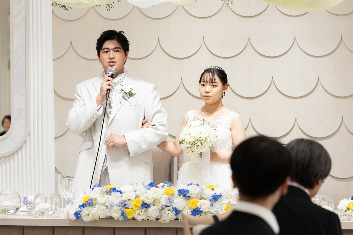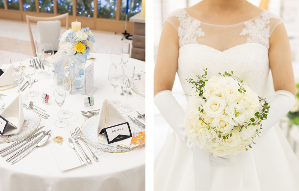 会場装花は白いバラをメインに、白を基調としながら青・紫・黄色を差し色として取り入れたデザインにしました。色の主張が強くなりすぎないよう、細かく調整していただいたところがポイントです。 当日の仕上がりは、打ち合わせでイメージしていた以上に素敵で、この空間で結婚式ができるのだと思うと、とても嬉しい気持ちになりました。