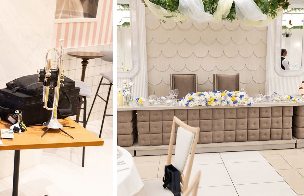 披露宴会場は白を基調とした内装で、どんな装飾や雰囲気も映えるところが魅力です。私たちは大好きなアイテムや音楽をちりばめた披露宴を意識しました。 ゲストの待合スペースには、夫愛用のトランペットや思い入れのある楽譜、ぬいぐるみやグッズなどを展示。 お色直しの衣装やブーケも、テーマに合わせて選び、曲もこだわりました。