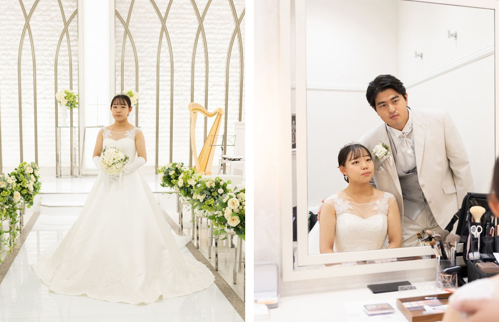 ウェディングドレスはPRIMACARAのドレスより選びました。Aラインのシルエットや装飾がとても素敵で、レースが綺麗なトレーンと、ボリュームのあるオーバースカートで雰囲気を変えられるのがポイントです。夫のタキシードも白で合わせています。白は普段あまり着ないので新鮮でした。