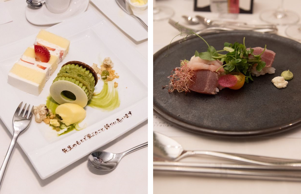 お料理は東雲というコースを選びました。お箸で食べられる創作フレンチで、どの料理もとても美味しく、特に抹茶のデザートはスイーツ好きの友人にも大好評でした。