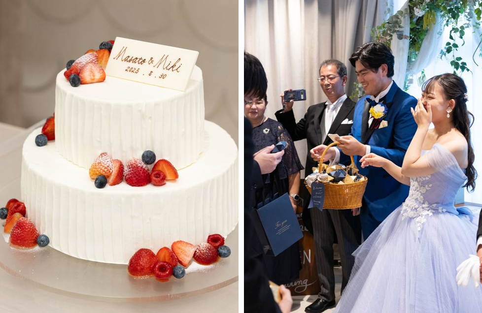 ウェディングケーキは白を基調とした2段ケーキです。ところどころにベリーがあしらわれていて、シンプルで可愛らしいケーキでした! 他にゲストへのおもてなしとして、引出物はゲストがそれぞれ好きなものを選べるように、カードタイプのカタログギフトを、プチギフトは星型の小箱に入れたクッキーで、ラメ入りの青と、光沢のある黄色で可愛らしいアイテムをお渡ししました。