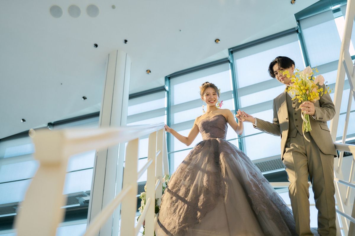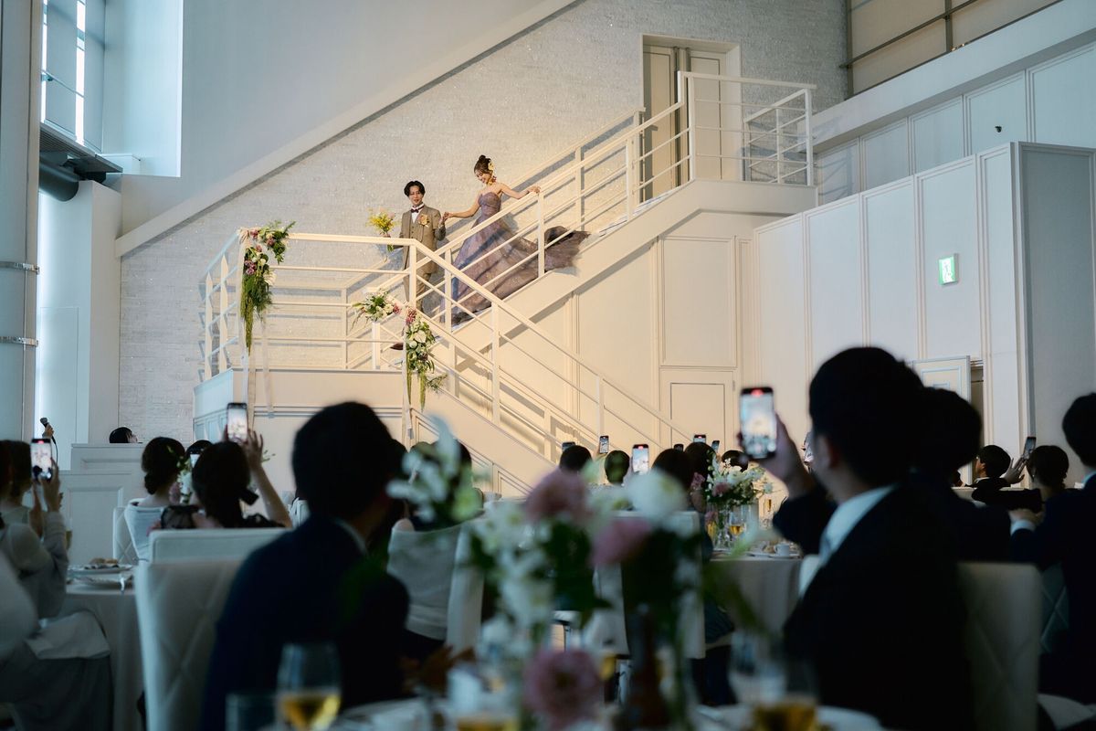 披露宴は『クリスタル レジデンス』という、壁がガラス張りで開放感のある会場で行いました。真っ白な内装なので、自分たちのカラーを存分に取り入れることができます。階段からの登場はゲストに驚きと喜びを与える演出となり、華やかな雰囲気をつくり出せたのも魅力でした。ゲストからは「もっとふたりが好きになった」「最高の結婚式だった」という言葉をもらえて嬉しかったです。