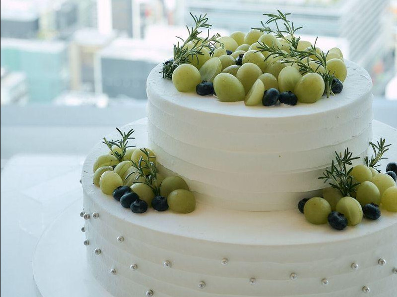 ウェディングケーキは2段の生クリームベースに、マスカットやブドウ、ローズマリーで彩りを添えたデザインです。希望をプランナーさんに伝えて、作っていただきました。